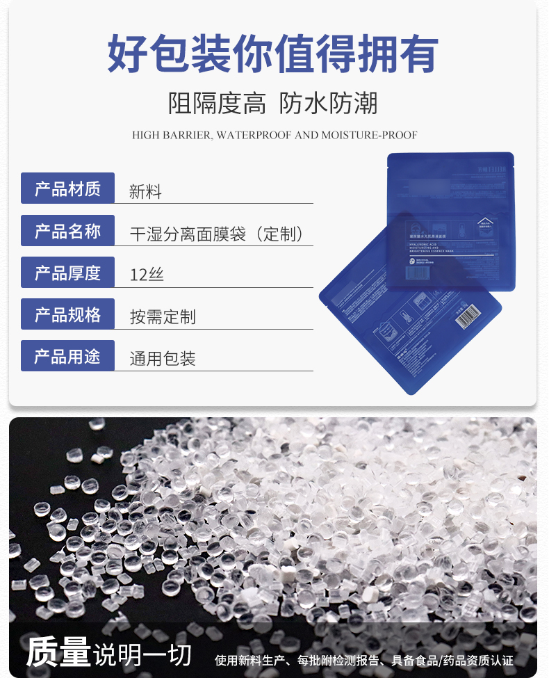 產(chǎn)品材質(zhì):新料 名稱:干濕分離面膜袋 厚度:12絲 規(guī)格:按需定制 用途:日化品包裝 膜液分離的干濕分離面膜袋技術(shù)可以,使精華液可以獨(dú)立包裝,保證穩(wěn)定性更優(yōu)的情況下,還能減少某些添加劑的使用。面膜在使用前十幾秒才解鎖“浸泡”,既杜絕面膜紙中化工成分的析出,又能最大程度地保證活性成分的被最大程度地吸收,新鮮程度是傳統(tǒng)浸泡式面膜無法比擬的。